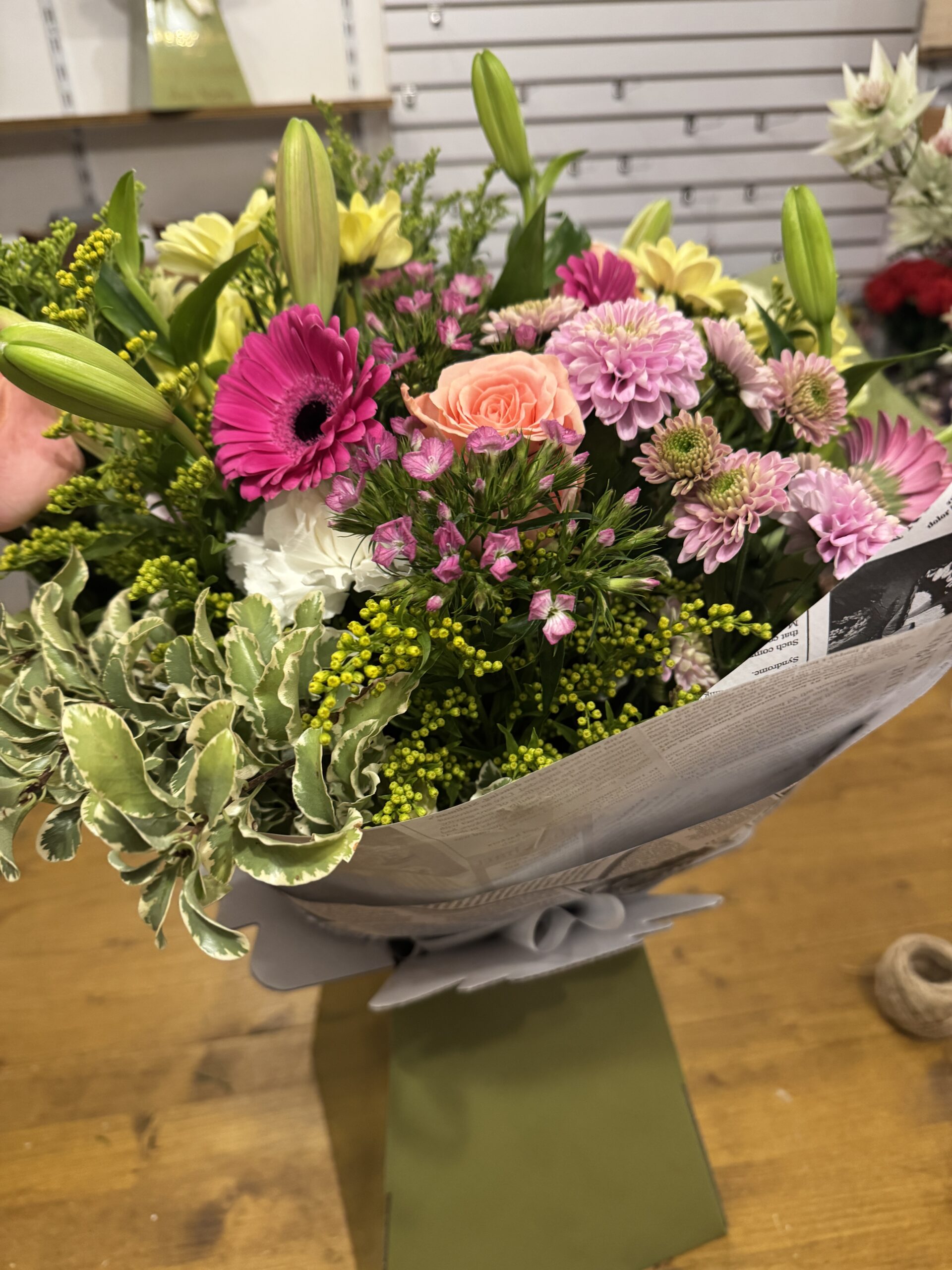 This weeks choice includes bright pink gerberas peach and white roses, pink lilies and more.