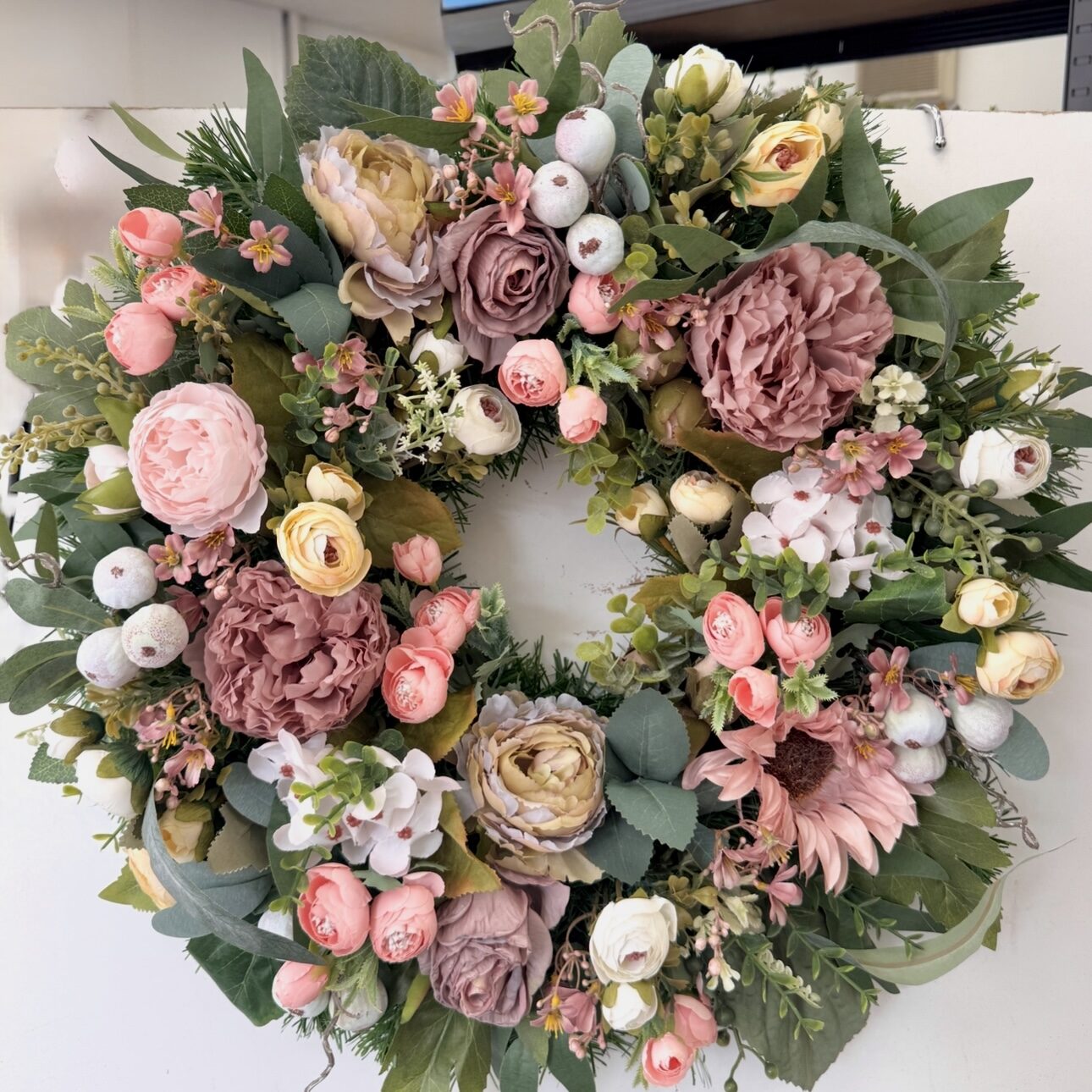 Vintage Explosion is part of our purse friendly range – a soft toned artificial wreath designed with dusky pink peonies, muted purple roses and green foliage with a subtle grey hue